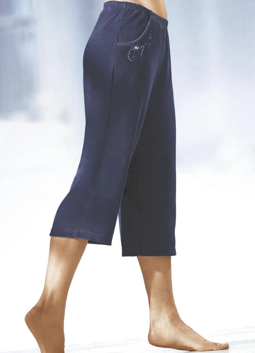 Flotte Caprihose mit bequemem Dehnbund rundum sowie zwei Seitennahttaschen mit dekorativer Schmucksteinzier.
