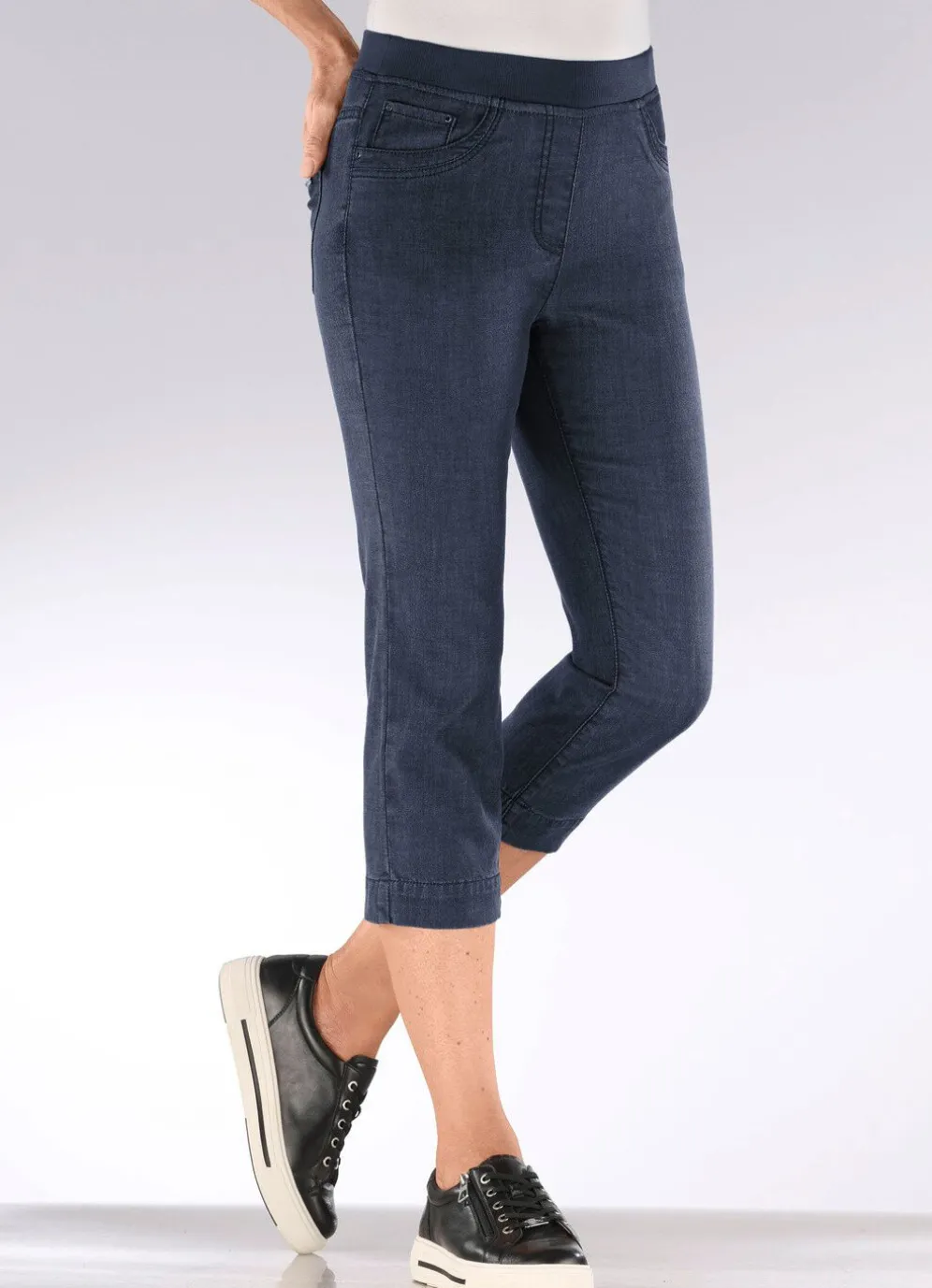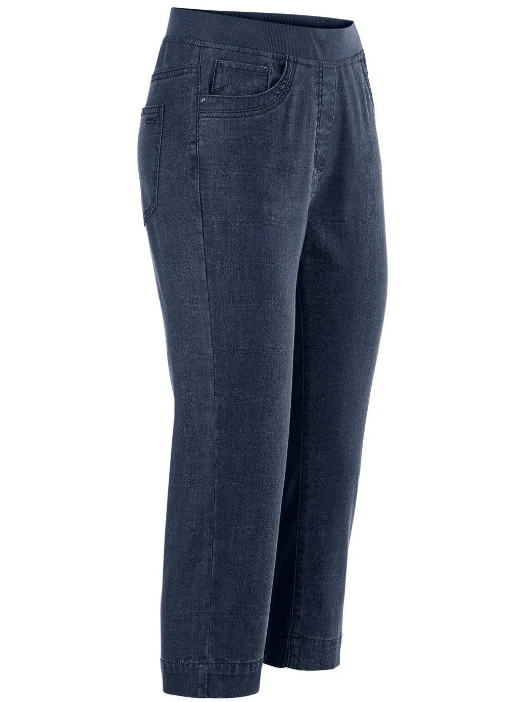 Flotte Caprijeans in 5-Pocket-Form: Schlupfform, formbeständiger Rundum-Dehnbund in Jersey-Qualität, angedeutete Reißverschluss-Zierblende, Strasssteinchenzier an den Taschen, Jeanssattel sowie breiter, abgesteppter Saumabschluss. Innenbeinlänge ca. 54 cm, Fußweite ab 37 cm.