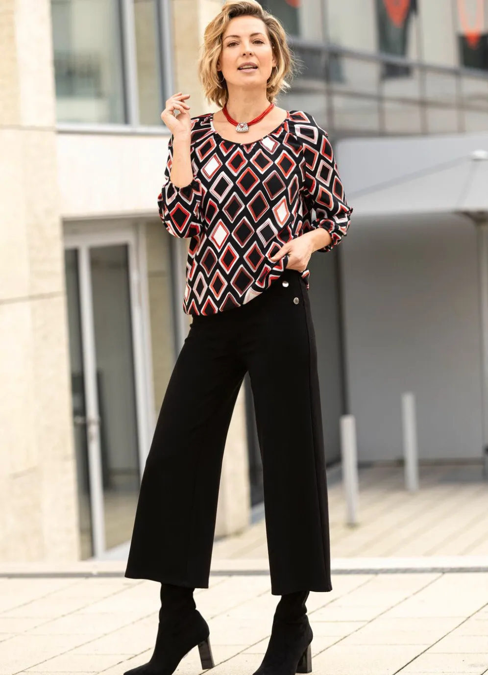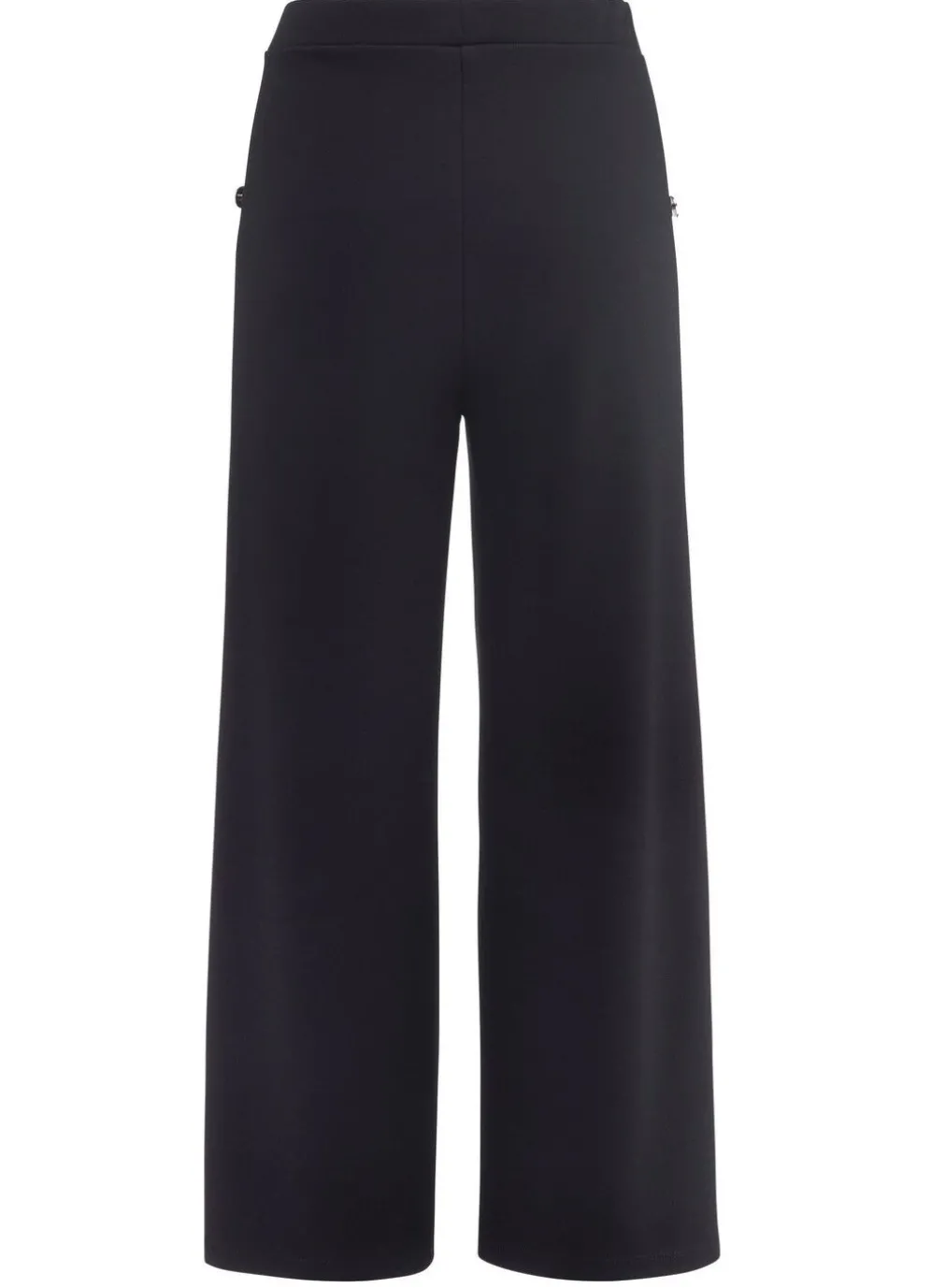 Attraktive Culotte in Schlupfform mit Dehnbund rundum, glatt anliegend dank der innenliegenden Gummibund-Einlage sowie Ziersteppungen in Seitentaschen-Optik mit Zierknöpfen. Innenbeinlänge ca. 62 cm, Fußweite ab 58 cm.