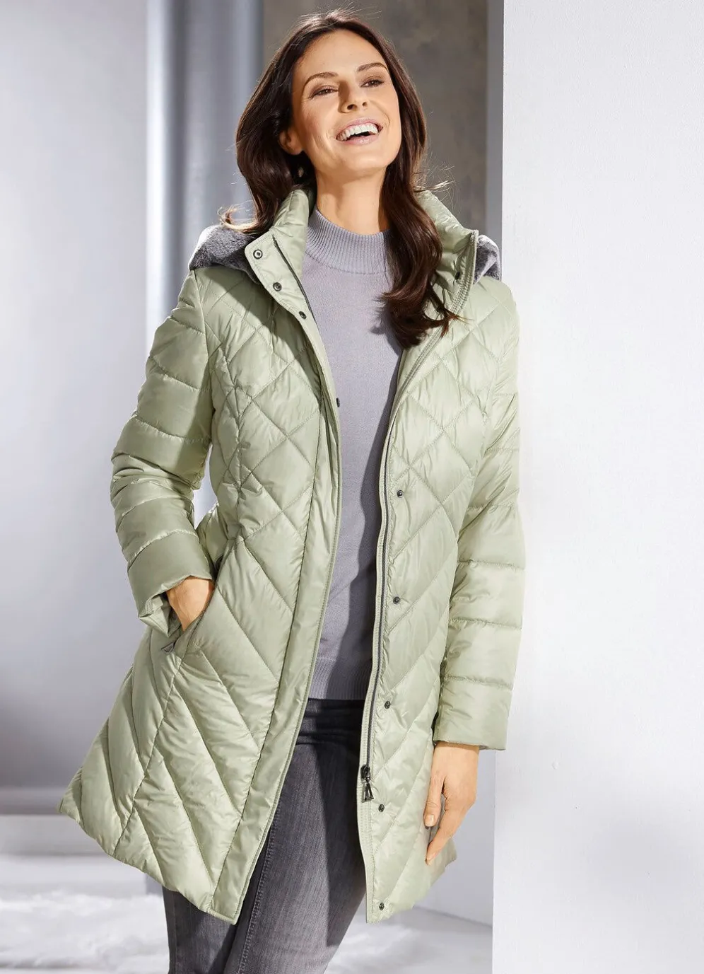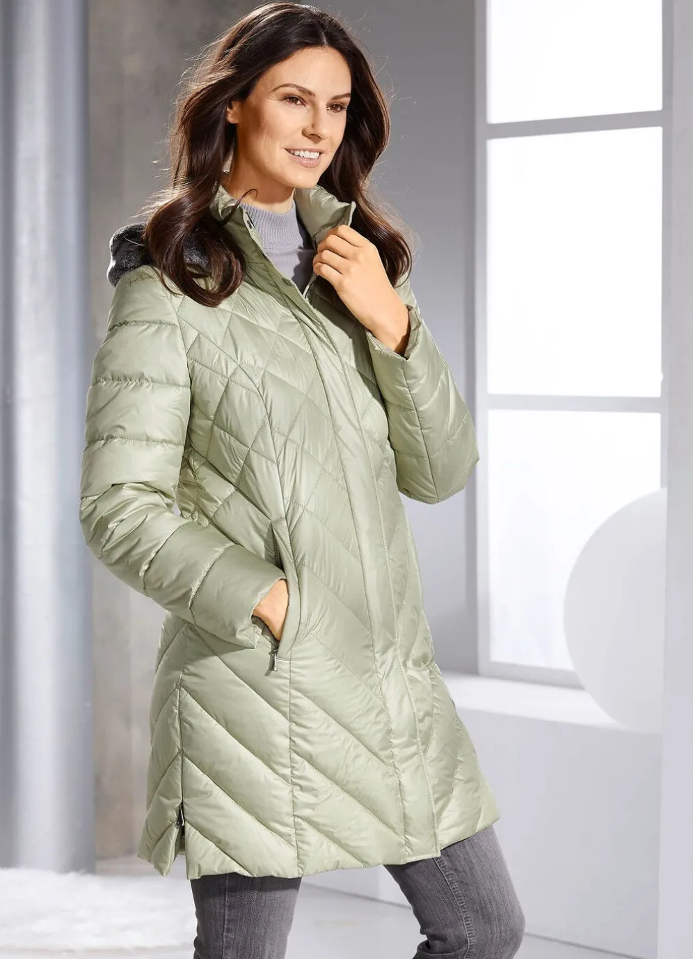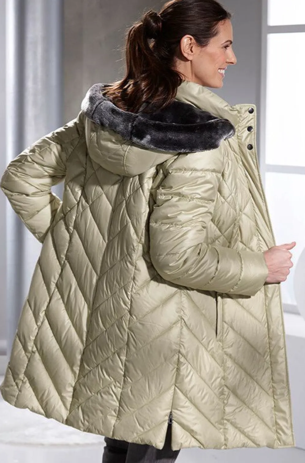 Ein Modell der Extraklasse ist dieser modische Daunen-Kurzmantel: abnehmbare Kapuze mit Kunstpelz-Innenausstattung, durch Reißverschluss unter verdeckter Druckerleiste hoch schließbarer Stehkragen, verdeckte Reißverschlusstaschen, Reißverschluss an den Seitenschlitzen, umschlagbare Ärmel sowie eine Innentasche. Länge ca. 90 cm.