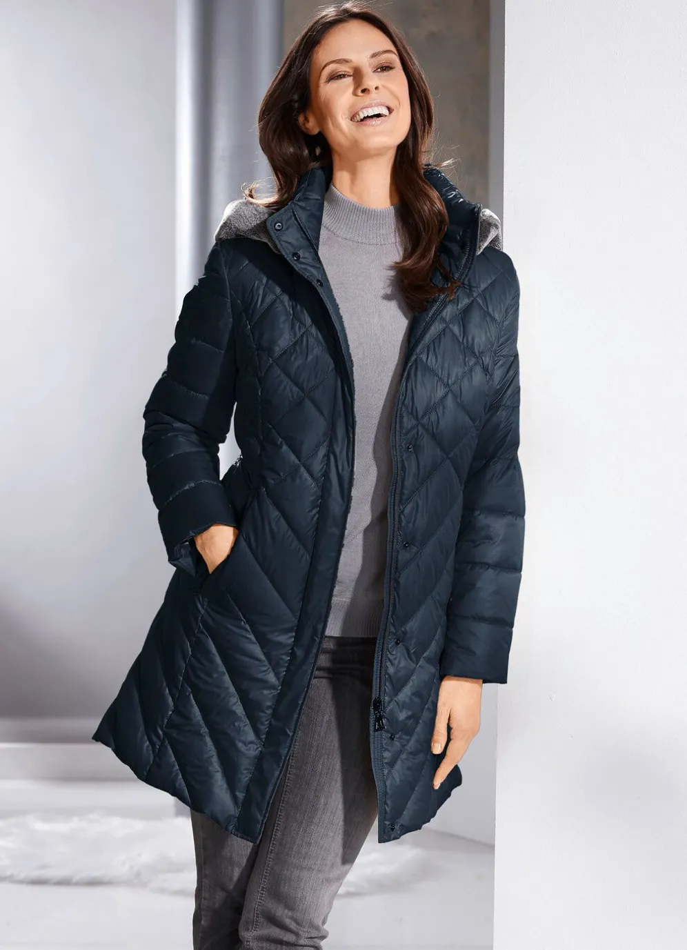 Ein Modell der Extraklasse ist dieser modische Daunen-Kurzmantel: abnehmbare Kapuze mit Kunstpelz-Innenausstattung, durch Reißverschluss unter verdeckter Druckerleiste hoch schließbarer Stehkragen, verdeckte Reißverschlusstaschen, Reißverschluss an den Seitenschlitzen, umschlagbare Ärmel sowie eine Innentasche. Länge ca. 90 cm.