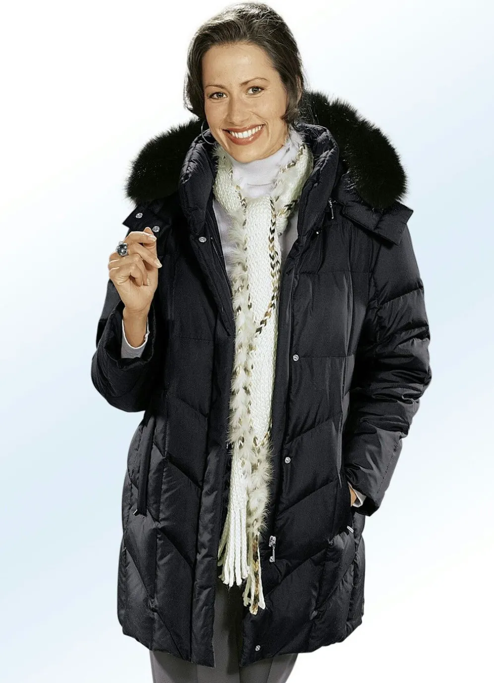Attraktive, antaillierte Daunenjacke in Schwarz: Stehkragen, abnehmbarer Kunstpelz-Besatz an der abnehmbaren Kapuze, Reißverschluss unter der verdeckten Druckerleiste, Taschen mit Reißverschluss und Blende, umschlagbare Ärmel, eine Innentasche und eine Handy-Innentasche. Länge ca. 84 cm.