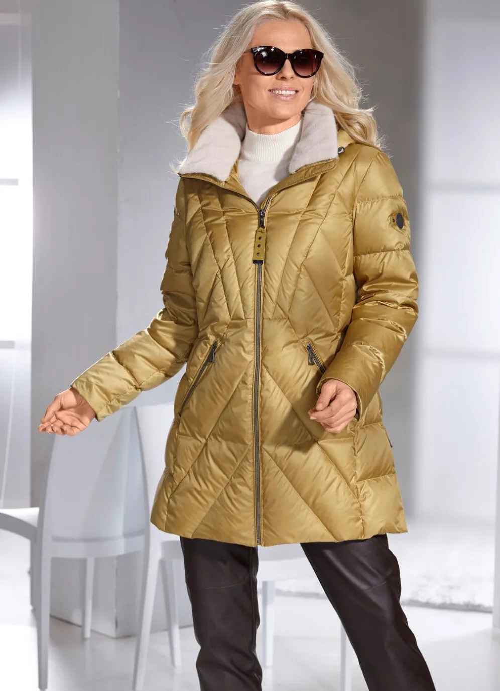 Daunenjacke mit Durchzugsband und Stopper an der abnehmbaren Kapuze, durch Reißverschluss hoch schließbarem Stehkragen mit abnehmbarem Kunstpelz-Besatz, Reißverschluss an den Taschen und Seitenschlitzen, umschlagbaren Ärmeln sowie einer Innentasche. Länge ca. 82 cm, ab Gr. 42 ca. 84 cm, ab Gr. 46 ca. 86 cm.