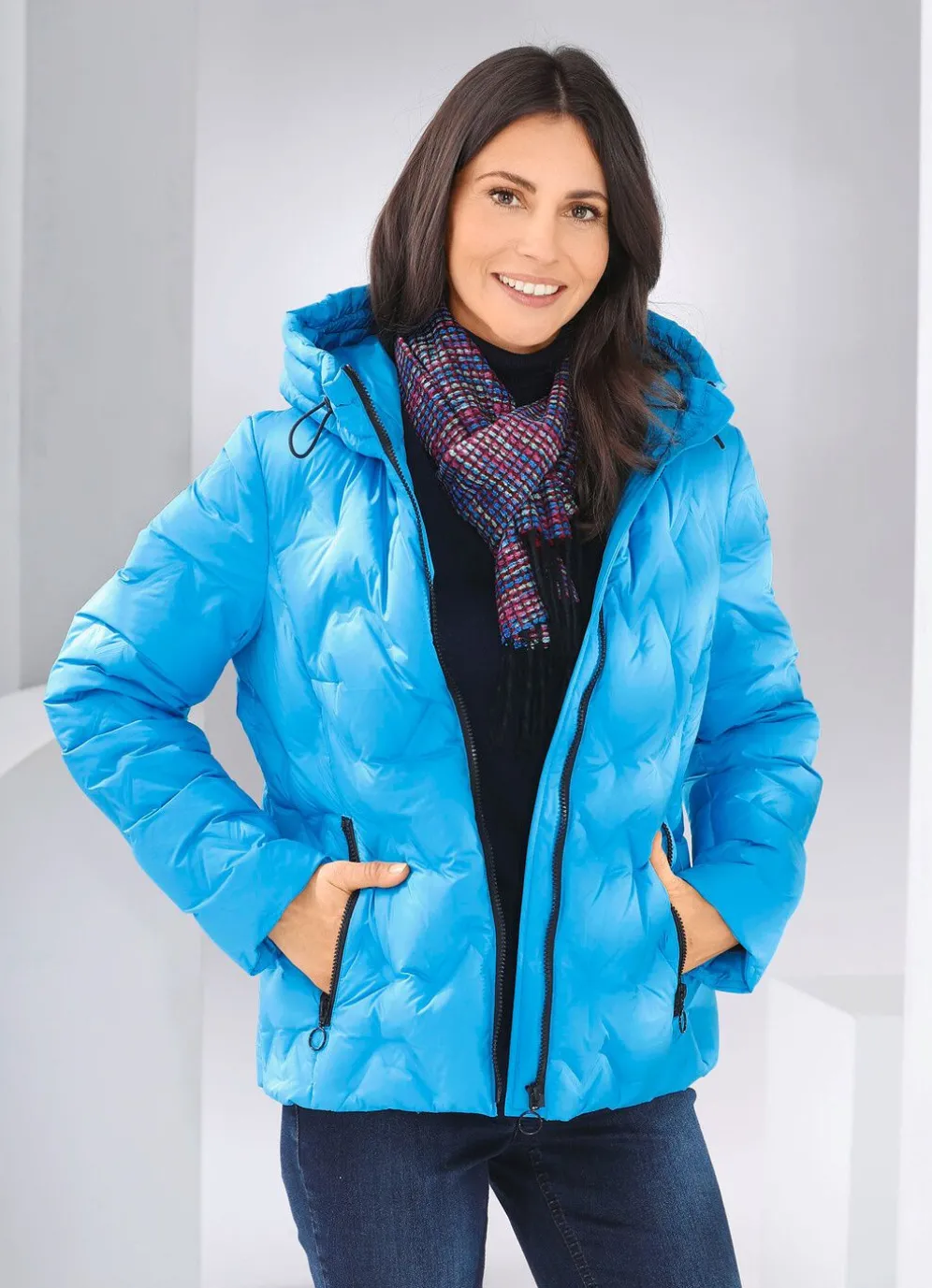 Daunenjacke in Aquamarin, mit geklebten Kammern, fester Kapuze mit Durchzugsband und Stopper, durch Reißverschluss hoch schließbarem Stehkragen, Reißverschlusstaschen sowie einer Innentasche. Länge ca. 66 cm, ab Gr. 42 ca. 68 cm, ab Gr. 46 ca. 70 cm, ab Gr. 50 ca. 72 cm.
