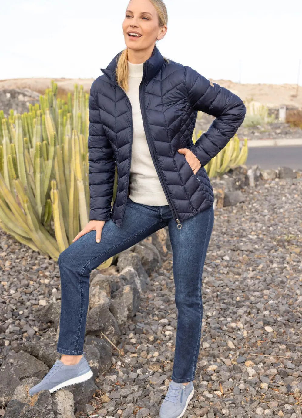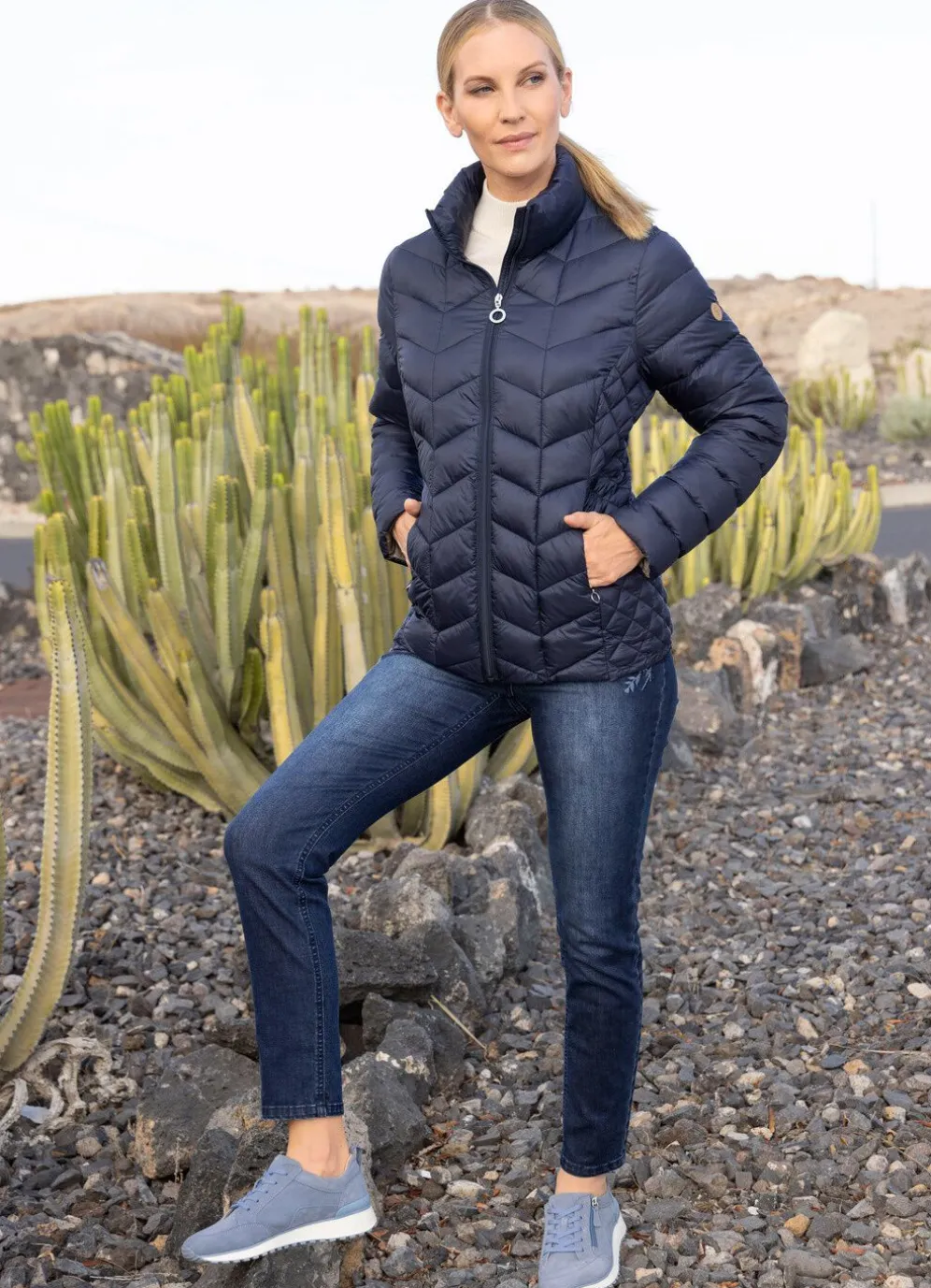Jacke mit verschiedenen Steppvarianten: durch Reißverschluss hoch schließbarer Stehkragen, sowie nahtfeine Reißverschlusstaschen. Länge ca. 65 cm, ab Gr. 42 ca. 68 cm, ab Gr. 48 ca. 71 cm.