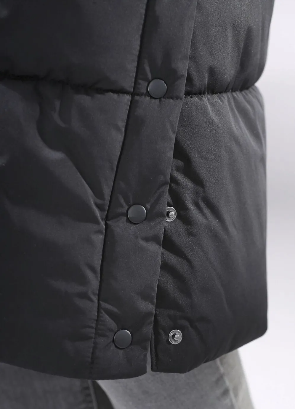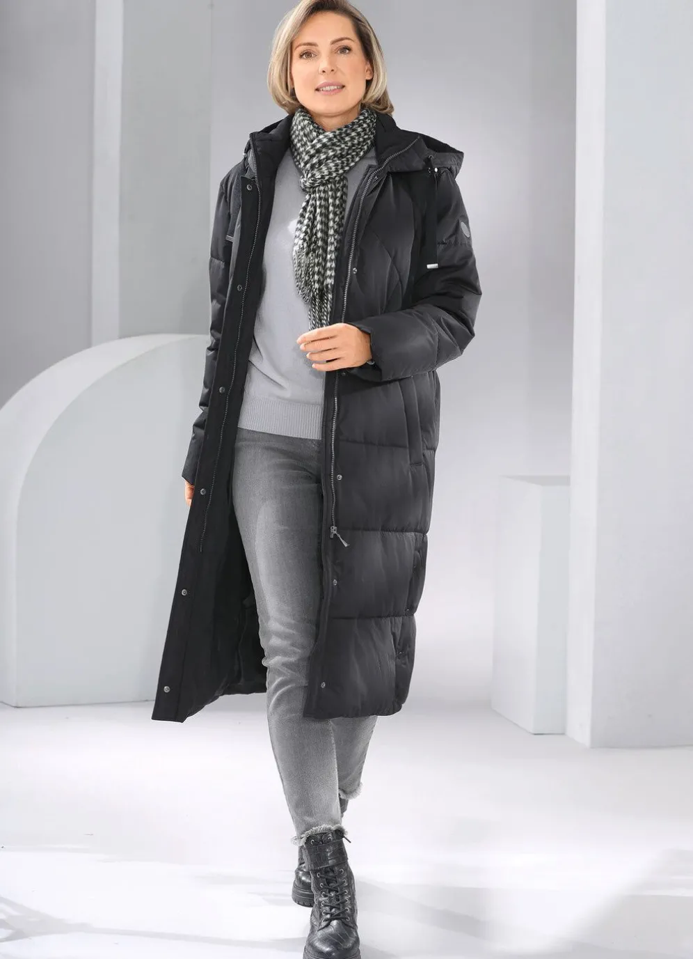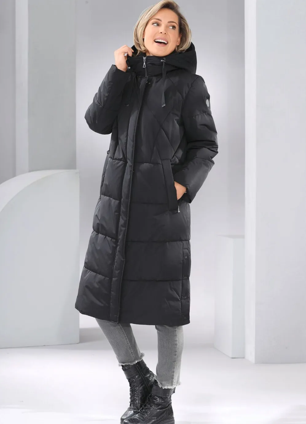 Daunenmantel: durch Reißverschluss unter verdeckter Druckerleiste hoch schließbarer Stehkragen, verdeckte Reißverschlusstaschen, Seitenschlitze mit Druckern, umschlagbare Ärmel sowie eine Innentasche. Länge ca. 110 cm.