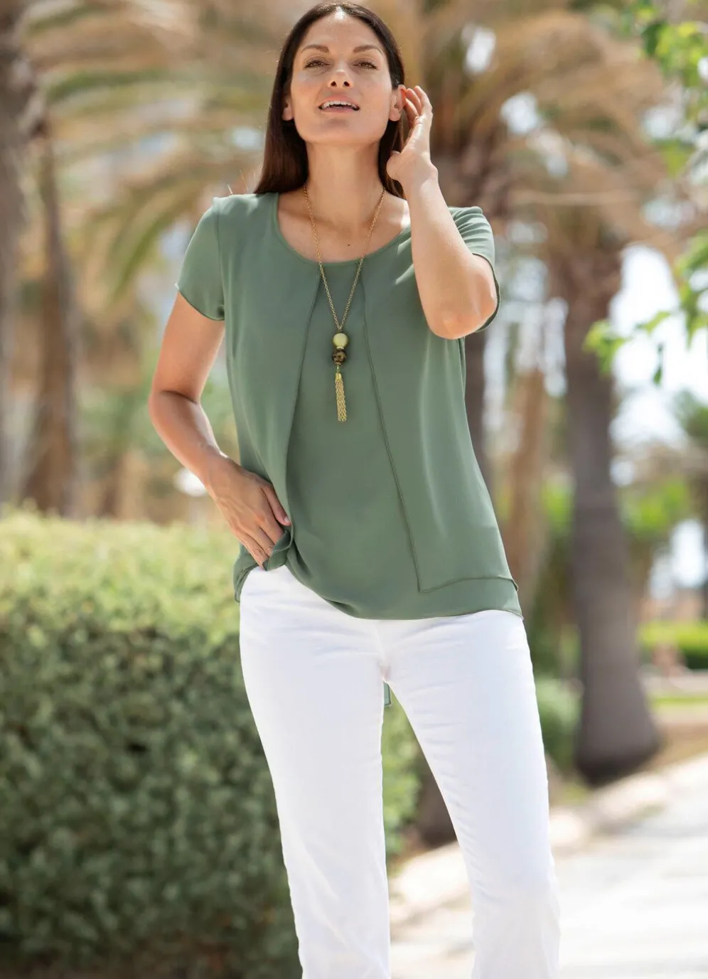 Tolle, doppellagige Tunika in Oliv: Chasuble-Optik im Vorder- und Rückteil, runder Halsausschnitt, kurze Ärmel.