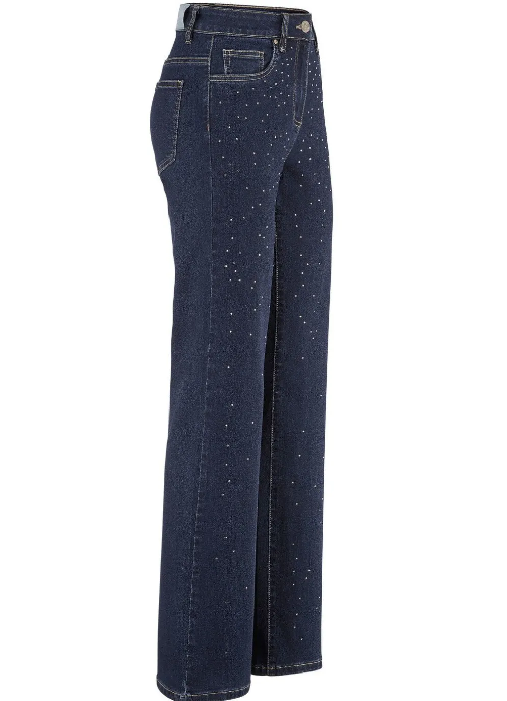 Extravagante Edeljeans mit modisch weitem Beinverlauf und dekorativer Strasszier im Vorderteil: 5-Pocket-Form, elastischer Formbund, Gürtelschlaufen, Knopf- und Reißverschluss sowie Jeanssattel. Innenbeinlänge ca. 78 cm, Fußweite ab 48 cm.