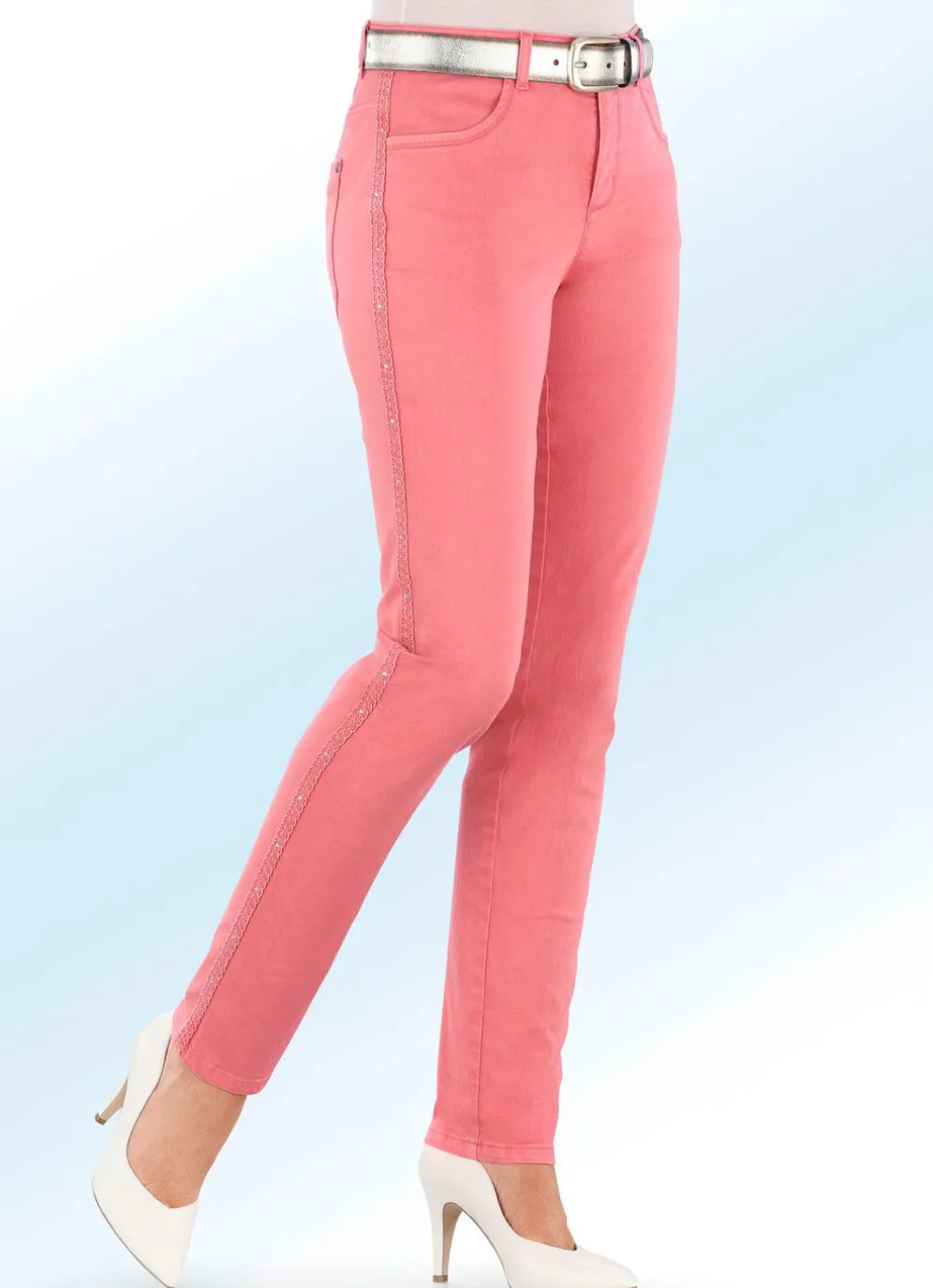Ein toller Blickfang bei dieser wunderschönen, hochelastischen Edel-Jeans in 4-Pocket-Form ist das effektvolle Zierband mit Strasssteinen enlang des Beinverlaufes: elastischer Bund, Gürtelschlaufen, Knopf- und Reißverschluss, Nietenzier an den Gesäßtaschen sowie Jeanssattel. Innenbeinlänge ca. 77 cm, Fußweite ab 30 cm.