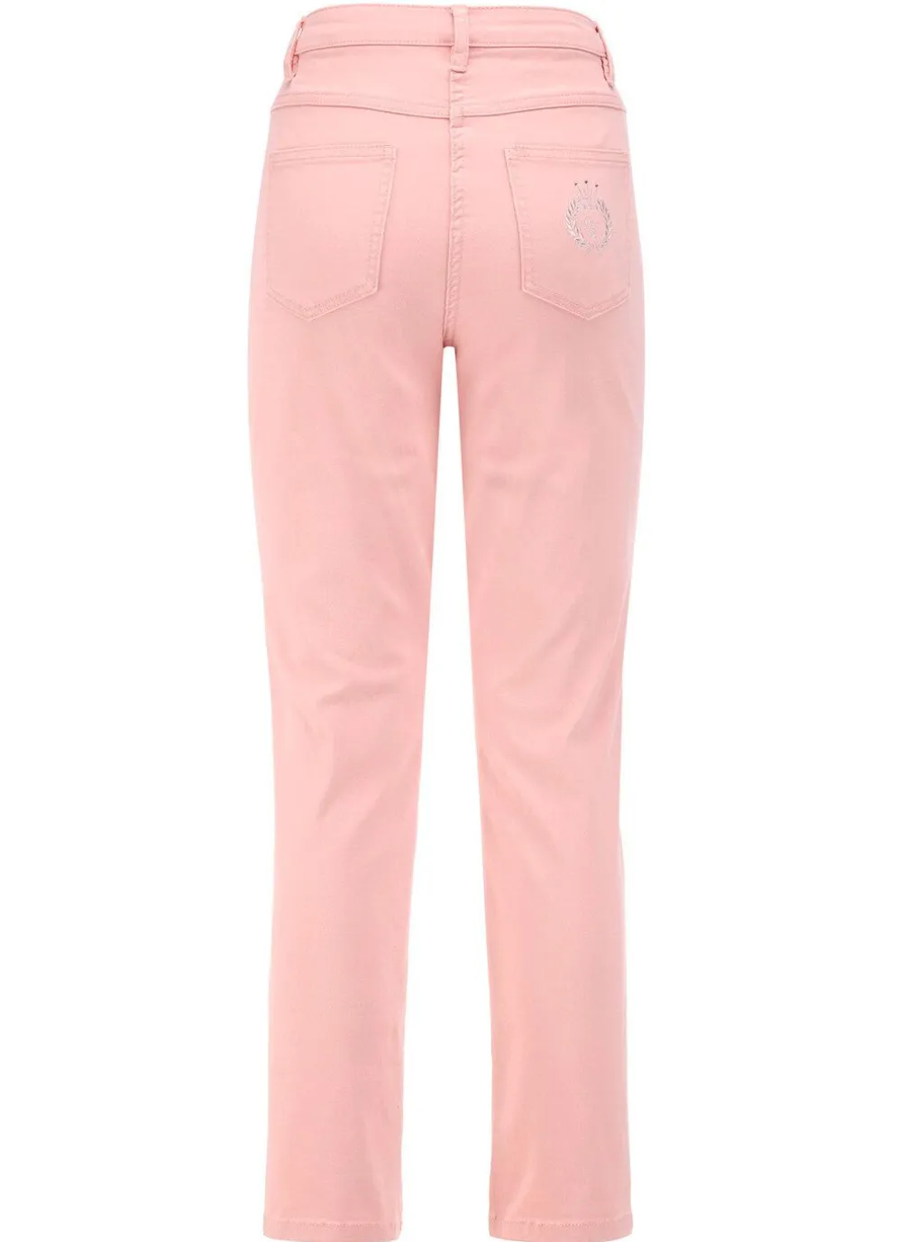 Für absolutes Wohlbefinden sorgt diese ansprechende Edeljeans in 7/8-Länge: 5-Pocket-Form, elastischer Formbund, Gürtelschlaufen, Knopf- und Reißverschluss sowie schöne, kontrastfarbene Stickerei, verziert mit Strasssteinen auf einer der aufgesetzten Gesäßtaschen, Jeanssattel sowie dezente Auswascheffekte. Innenbeinlänge ca. 68 cm, Fußweite ab 32 cm.