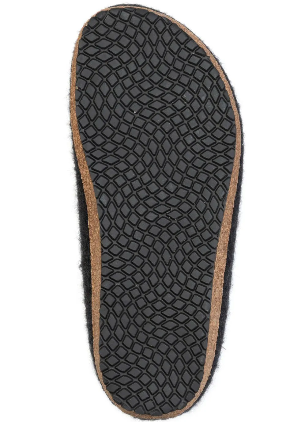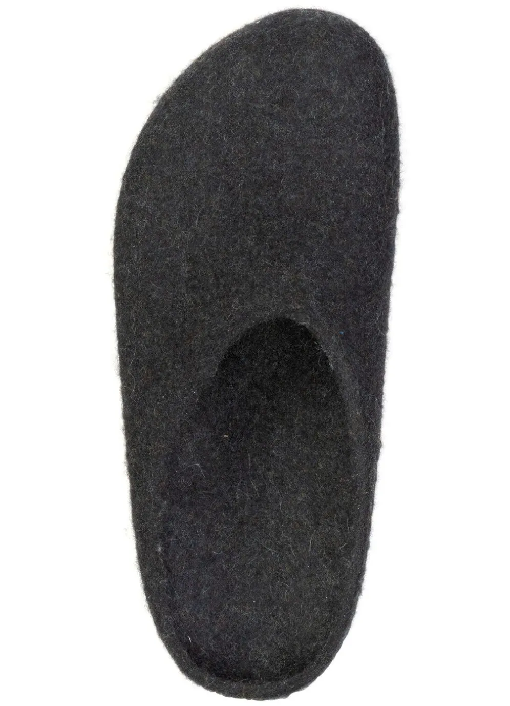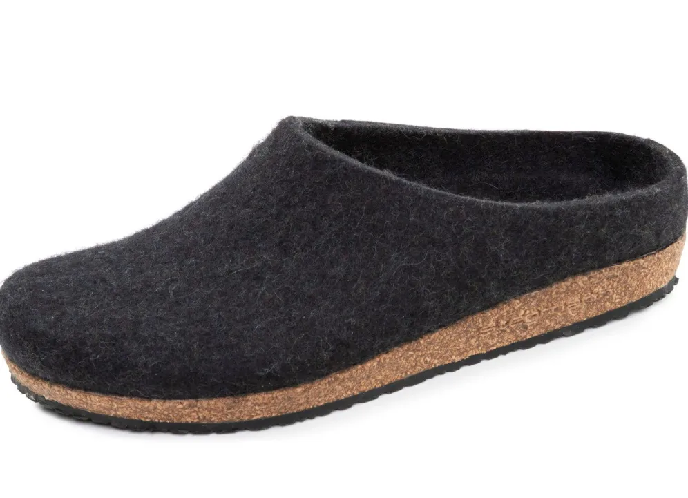Edle Hausschuhe in Grafit, nahtlos handgefilzt in Österreich aus reiner Schurwolle ohne chemische Zusätze: Weite G, anatomisch geformter Kork-Latex-Boden mit Gummi-Laufsohle sowie 15 mm Keilabsatz