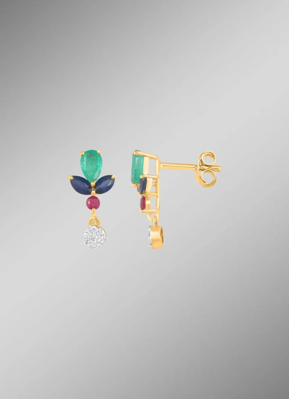 Diese edlen Ohrstecker aus feinem Gold – wahlweise in 585/- oder 375/- Legierung – vereinen luxuriöse Materialien mit meisterhafter Verarbeitung auf kleinstem Raum. Mit einer Länge von 13 mm präsentieren sie ein faszinierendes Farbspiel aus echten Rubinen, Saphiren und Smaragden, kunstvoll arrangiert und harmonisch ergänzt durch 14 strahlend weiße Diamanten in SI-Reinheit. Jeder Stein wurde sorgfältig ausgewählt, um die natürliche Schönheit und Brillanz dieses Schmuckstücks zu unterstreichen.