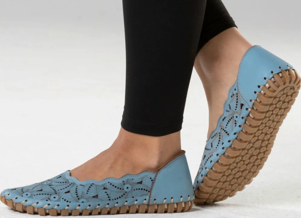 Luftig perforierter ELENA EDEN-Ballerina aus weichem Nappaleder, mit interessanter Prägung: Lederfutter, gepolsterte Lederdecksohle, superleichte TPU-Noppensohle sowie 10 mm Keilabsatz