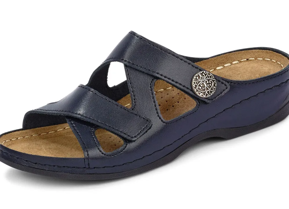 Pantoletten von ELENA EDEN, aus Rind-Nappaleder: in Weite G, zwei verstellbare Klettspangen, gepolstertes Lederfußbett mit Pelotte und Gelenkstütze, leichte PU-Riffelsohle und 30 mm Keilabsatz