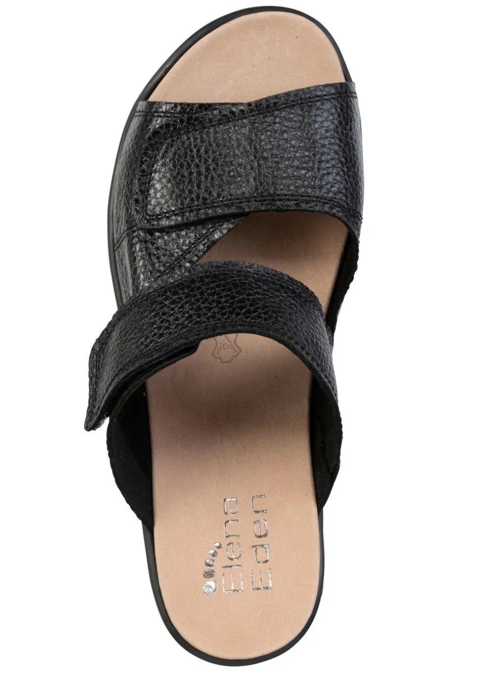 Pantoletten von ELENA EDEN aus weichem, genarbtem Hirschleder, mit verdecktem Gummizug: Weite H, zwei verstellbare Klettspangen, herausnehmbares Lederfußbett, leichte PU-Riffelsohle sowie 20 mm Keilabsatz