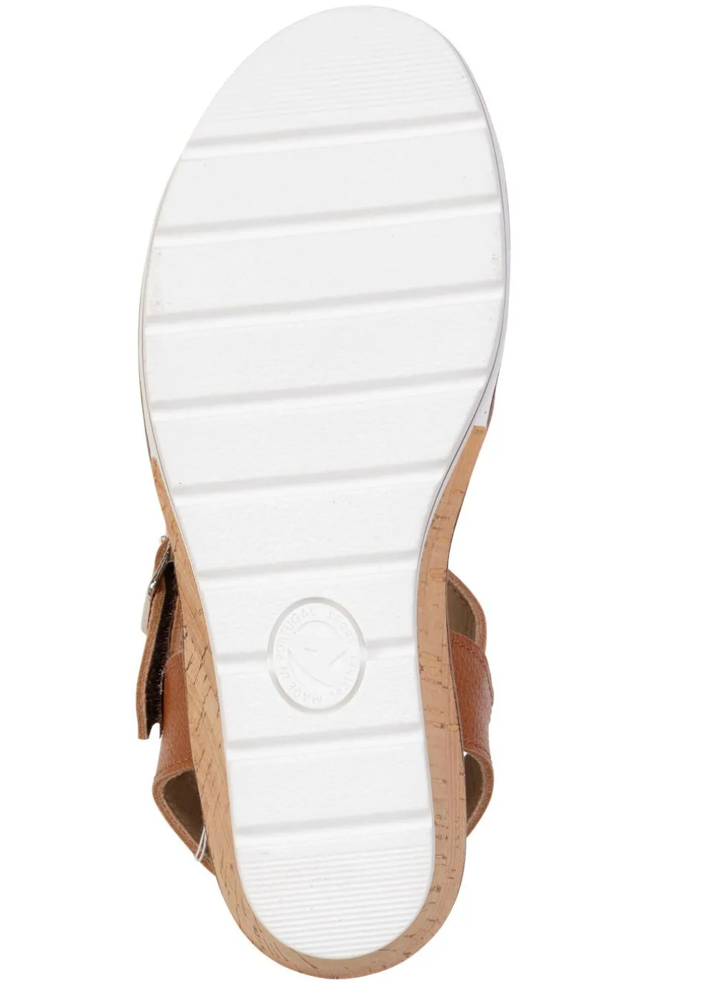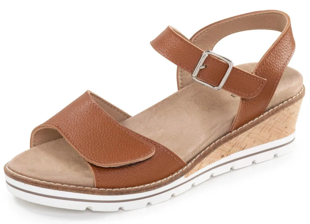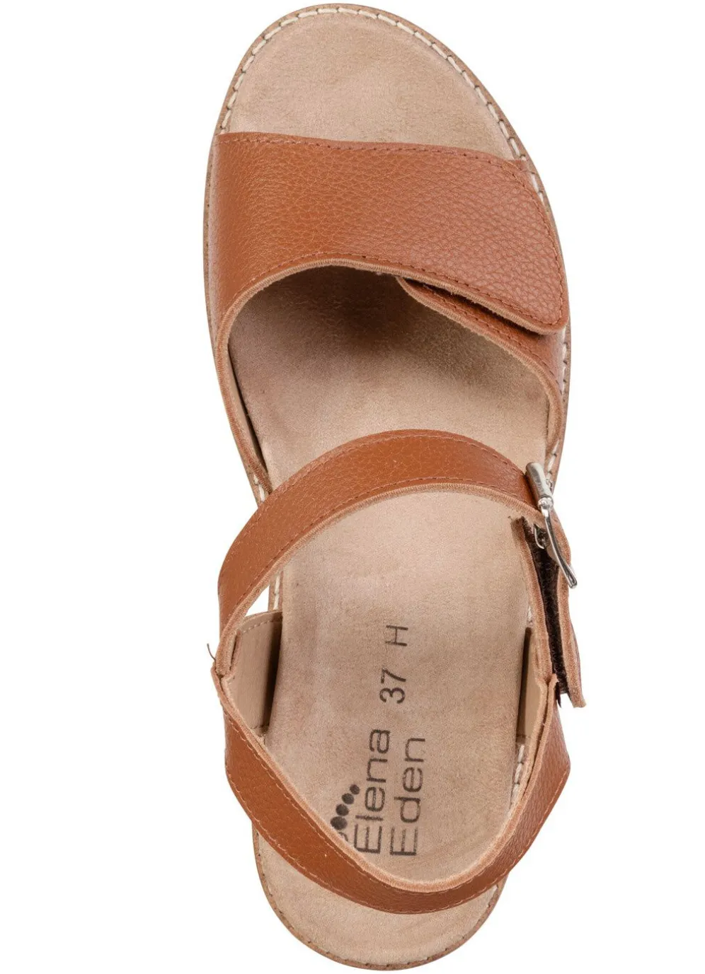 Sandaletten von ELENA EDEN, aus genarbtem Nappaleder: Weite H, Zierschließe mit verdecktem Klettverschluss, Front-Klettspange, Futter, herausnehmbares Fußbett, TR-Profilsohle sowie korkbezogener 35 mm Keilabsatz