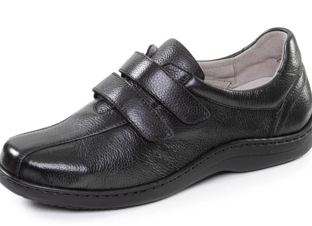Slipper von ELENA EDEN aus genarbtem Nappaleder mit zwei verstellbaren Klettspangen: Weite H, gefüttertes Quartier, herausnehmbares Lederfußbett, leichte PU-Riffelsohle sowie 15 mm Keilabsatz