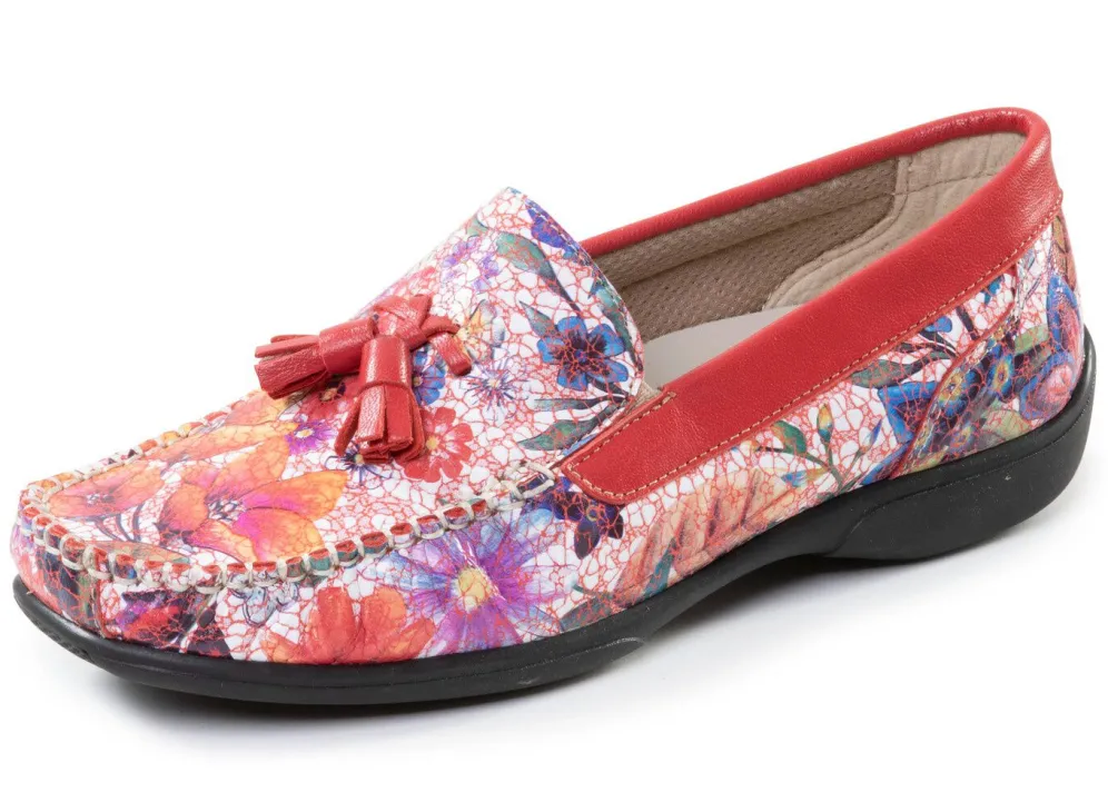 Slipper von ELENA EDEN aus floral bedrucktem Chevreau-Leder mit dezentem Glanz, in Mokassin-Verarbeitung: Weite H, Zierquasten, seitliche Gummizüge, Textilfutter, herausnehmbares Lederfußbett, leichte TR-Riffelsohle sowie 15 mm Keilabsatz