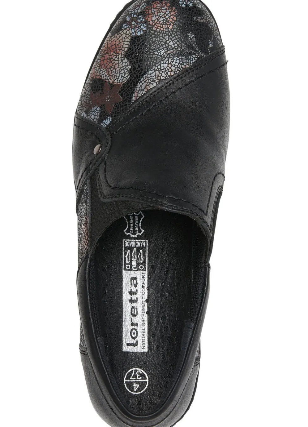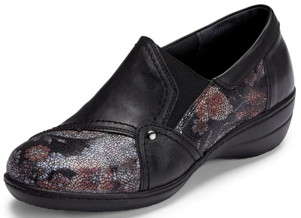 Schwarze Slipper von ELENA EDEN aus Nappaleder, teilweise mit floraler Prägung: in Weite H, zwei seitliche Gummizüge, Textilfutter, herausnehmbares Lederfußbett, leichte PU-Laufsohle, 30 mm Keilabsatz