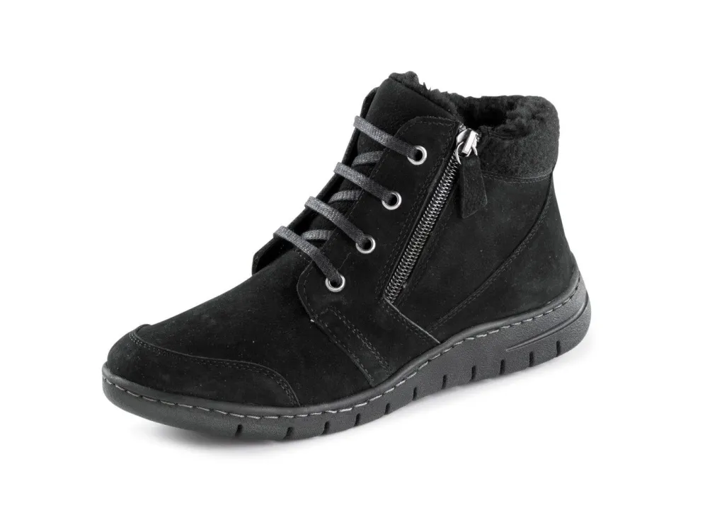 Boots von ELENA EDEN, aus Nubukleder, mit Schaftrand aus Textilmaterial: Weite H, Schnürung, Seitenreißverschluss, Warmfutter und herausnehmbares Fußbett aus 100% Polyester, leichte TR-Profilsohle sowie 15 mm Keilabsatz. Schafthöhe ca. 9 cm