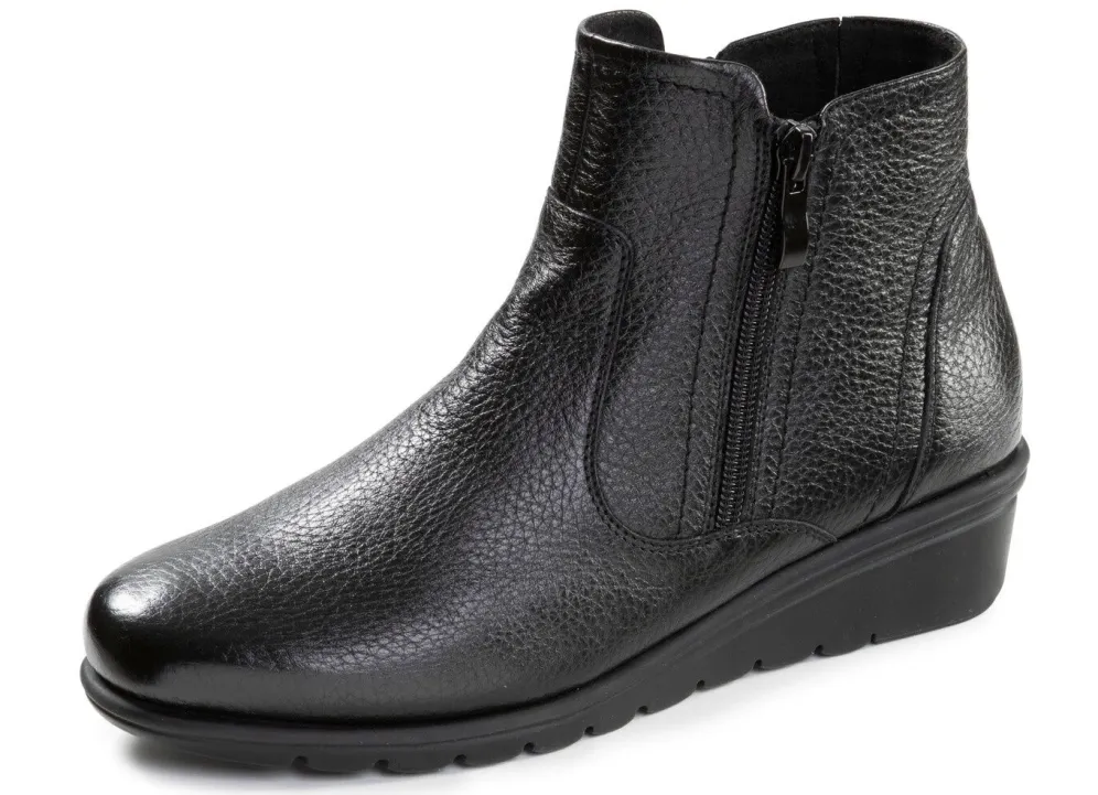 Stiefeletten von ELENA EDEN, aus weichem Hirsch-Nappaleder, mit zwei Seiten-Reißverschlüssen und verdecktem Gummizug am Schaft: Weite G, wärmendes Textilfutter, gepolsterte Decksohle, leichte TPR-Laufsohle sowie 30 mm Keilabsatz. Schafthöhe ca. 11 cm