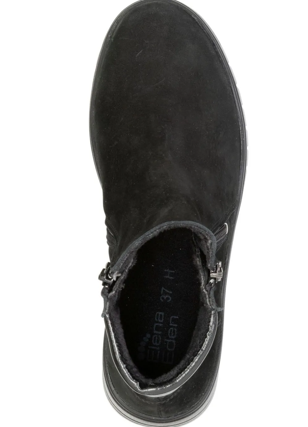 Schwarze Stiefeletten von ELENA EDEN, aus Nubukleder mit Nappaleder-Besatz: Weite H, zwei seitliche Reißverschlüsse, wärmendes Textilfutter, herausnehmbares Fußbett, leichte PU-Laufsohle sowie 25 mm Keilabsatz. Schafthöhe ca. 9 cm
