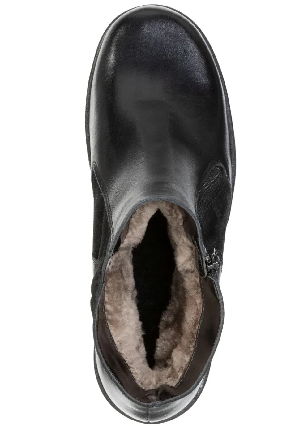 Schwarze Stiefeletten von ELENA EDEN aus weichem Nappa- und Veloursleder: Weite H, praktischer Seitenreißverschluss, Elastikeinsatz, echtes, molliges Lammfellfutter, warme Wolldecksohle, leichte Synthetik-Profilsohle, 30 mm Keilabsatz. Schafthöhe ca. 14 cm