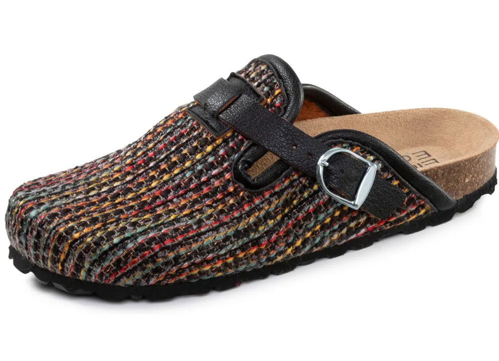 Clogs von ELENA EDEN in Schwarz-Multicolor aus grob gewebtem Textilmaterial, mit verstellbarer Spange: Weite H, Textilfutter, gepolstertes Lederfußbett, leichte EVA-Profilsohle sowie 10 mm Keilabsatz