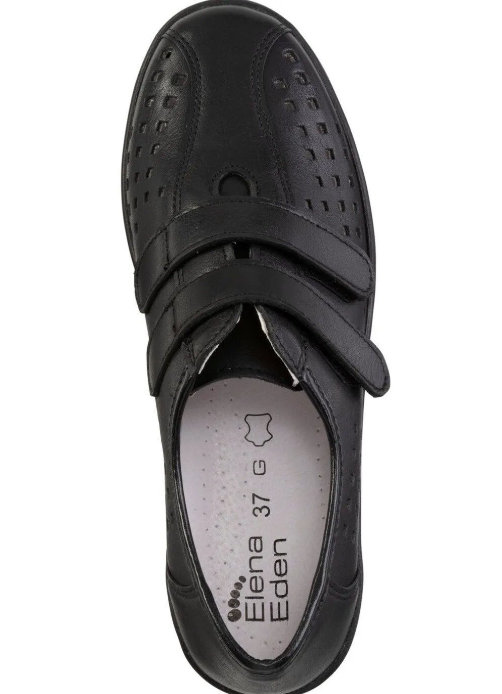 Schwarzer Klettschuh von ELENA EDEN, aus Nappaleder mit luftiger Perforation: Weite G, Futter, herausnehmbares Lederfußbett, leichte PU-Laufsohle sowie 20 mm Keilabsatz