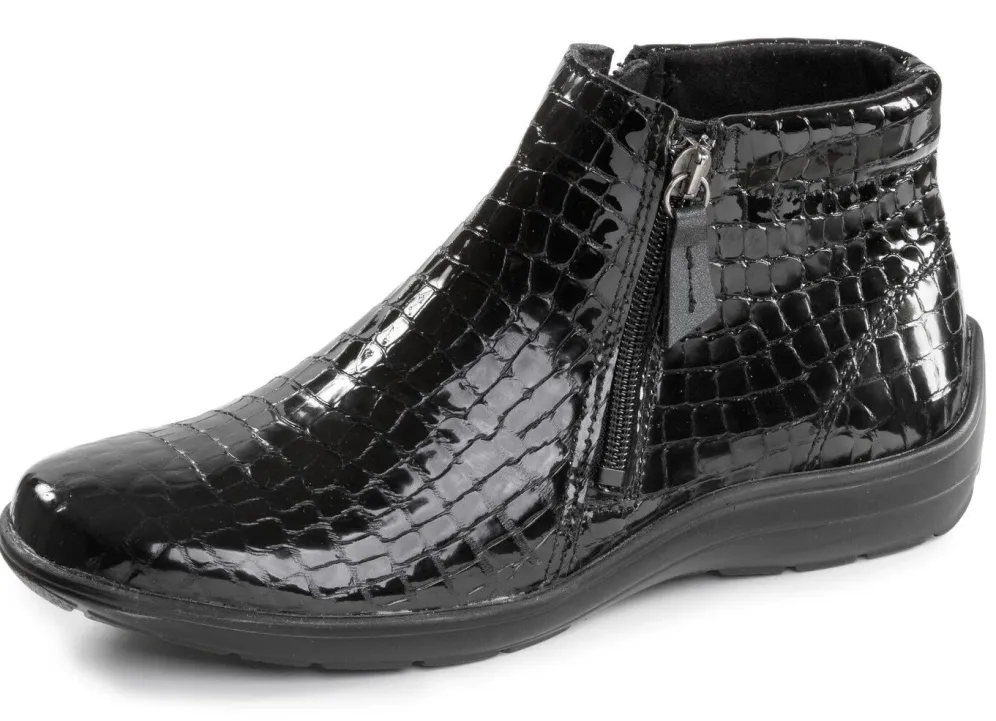 Stiefeletten von ELENA EDEN, aus edlem, krokogeprägtem Lackleder, mit zwei Seitenreißverschlüssen: Weite H, Textilfutter, herausnehmbares Fußbett, superleichte PU-Profilsohle sowie 15 mm Keilabsatz. Schafthöhe ca 9 cm