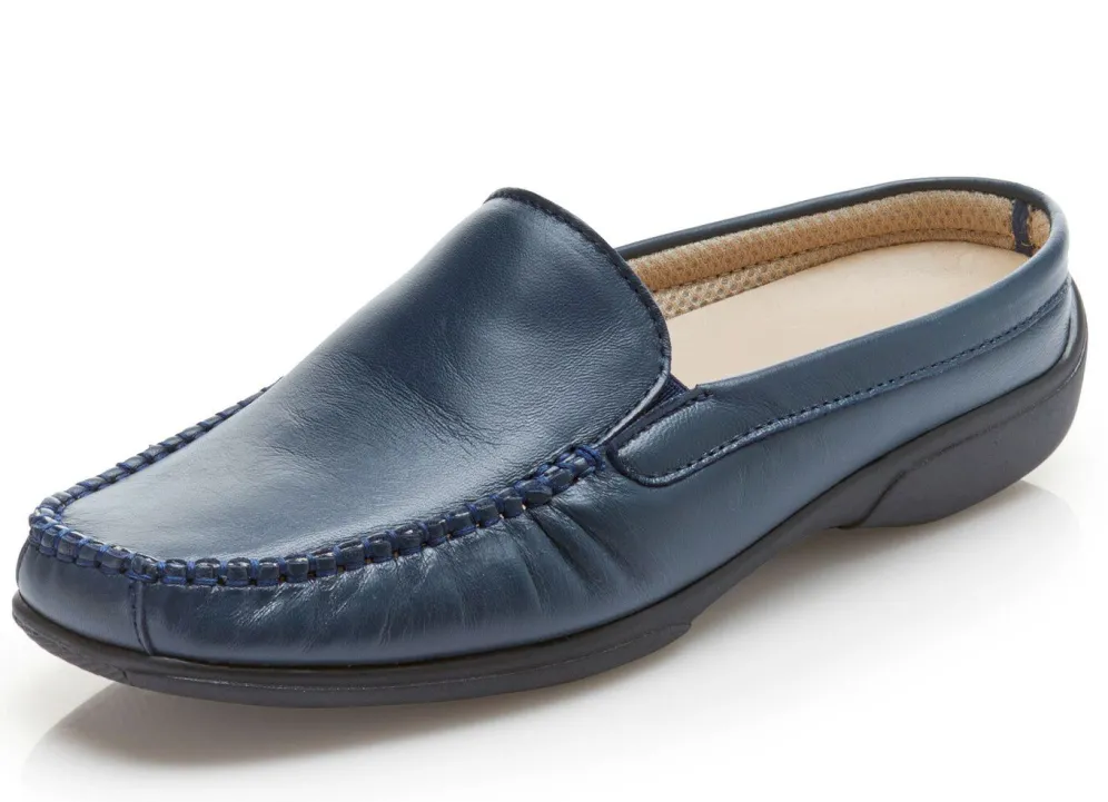 Mokassin-Sabot von ELENA EDEN aus Chevreauleder mit seitlich eingesetzten Gummizügen: in Weite H, herausnehmbares Lederfußbett, Textilfutter, leichte EVA-Laufsohle sowie 20 mm Absatz