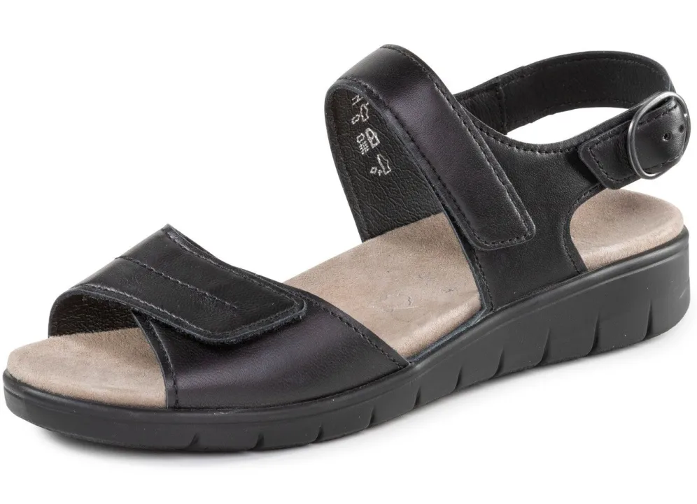 ELENA EDEN-Sandale aus Nappaleder, in Hellgrau aus teilweise geprägtem Veloursleder, mit zwei Klettspangen und verstellbarem Fersenriemchen: Weite H, Lederfutter, herausnehmbares Lederfußbett, superleichte PU-Luftpolster-Profilsohle sowie 20 mm Keilabsatz