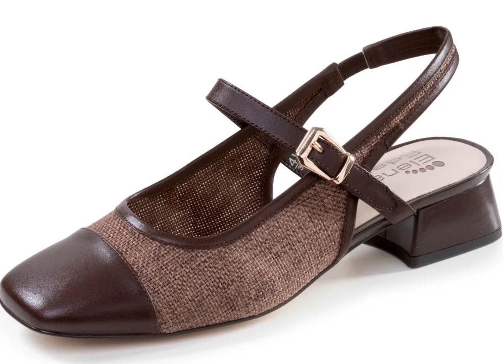 Slingpumps von ELENA EDEN aus geflochtenem Textilmaterial und Nappaleder, mit Zier-Schließe und Fersen-Gummizug: Weite G, verdeckter Klettverschluss, gepolsterte Lederdecksohle, Synthetik-Riffelsohle sowie lederbezogener 30 mm Absatz
