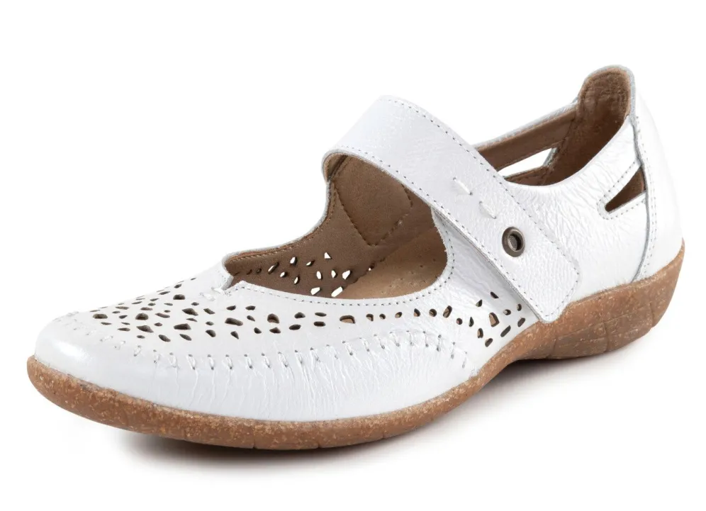 Luftig durchbrochener Slipper von ELENA EDEN, aus Perlatoleder oder genarbtem Nubukleder: Weite G, verstellbare Klettspange, Futter, herausnehmbares Lederfußbett, superleichte PU-Laufsohle sowie 15 mm Keilabsatz