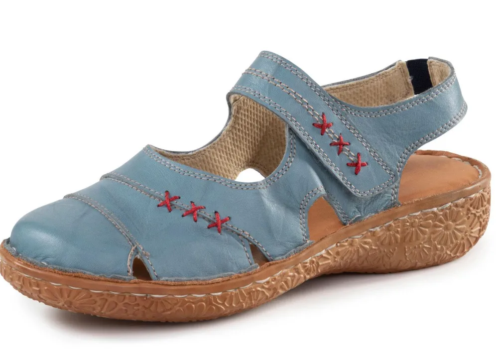 Luftig durchbrochener Slipper von ELENA EDEN, aus Nappaleder mit Knitter-Struktur: Weite G, verstellbare Klettspange, Fersengummizug, Textilfutter, gepolsterte Lederdecksohle, leichte PU-Laufsohle sowie 20 mm Keilabsatz