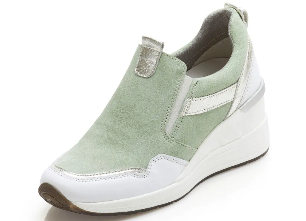 Slipper von ELENA EDEN, aus Rind-Veloursleder sowie Nappaleder in Weiß und Silber, mit seitlich eingesetzten Gummizügen: in Weite H, Textilfutter, herausnehmbares Fußbett, leichte TR-Laufsohle sowie 50 mm Keilabsatz