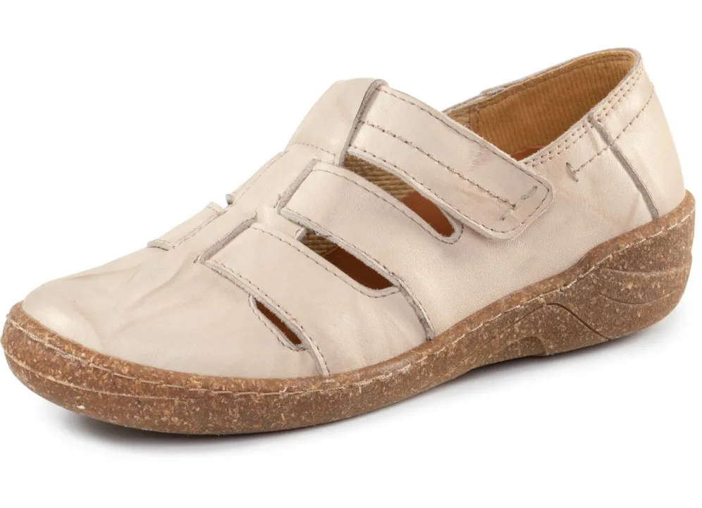 Luftig durchbrochener ELENA EDEN-Slipper aus Nappaleder, mit Knitter-Struktur: Weite G, Klettspange, Textilfutter, herausnehmbares Lederfußbett, leichte PU-Riffelsohle sowie 20 mm Keilabsatz