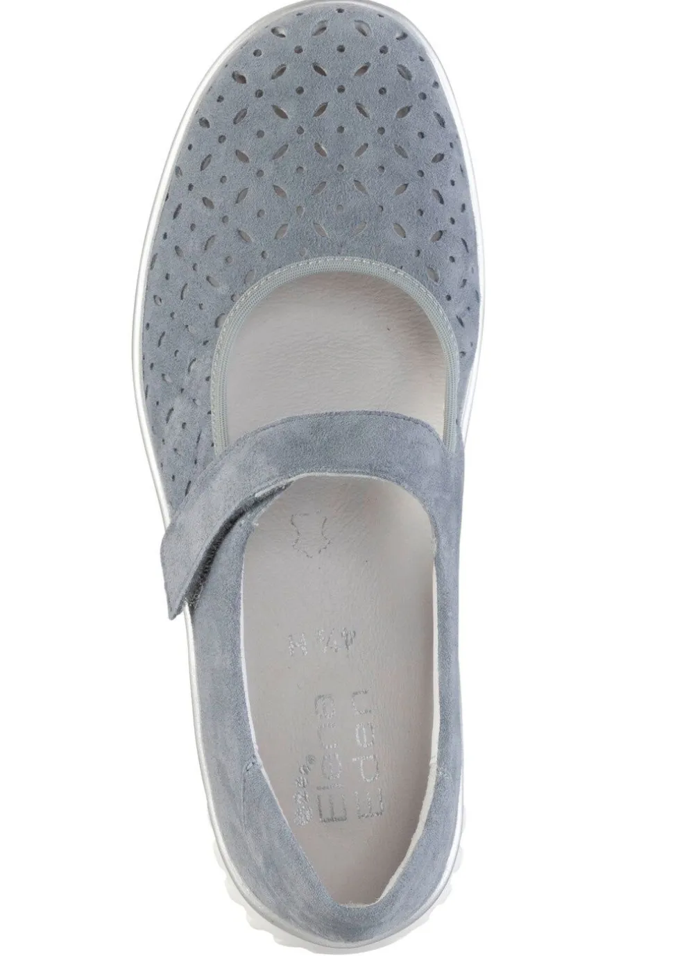 Hochwertiger Spangenschuh von ELENA EDEN, aus Veloursleder mit luftigen Durchbrüchen: Weite H, Klettverschluss, Lederfutter, herausnehmbares Lederfußbett, leichte PU-Luftpolster-Profilsohle sowie 20 mm Keilabsatz