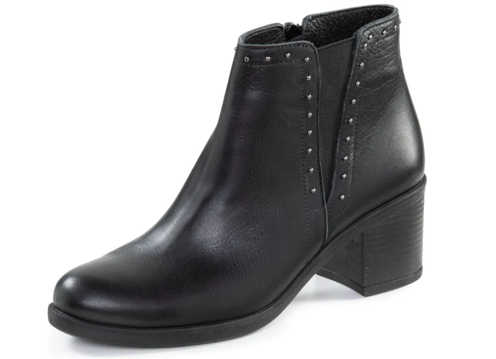 ELENA EDEN-Stiefelette aus Nappaleder, mit angesagten Ziernieten und seitlichem Elastikeinsatz: Innenreißverschluss, wärmendes Textilfutter, leichte Synthetik-Laufsohle sowie 55 mm Absatz. Schafthöhe ca. 12 cm