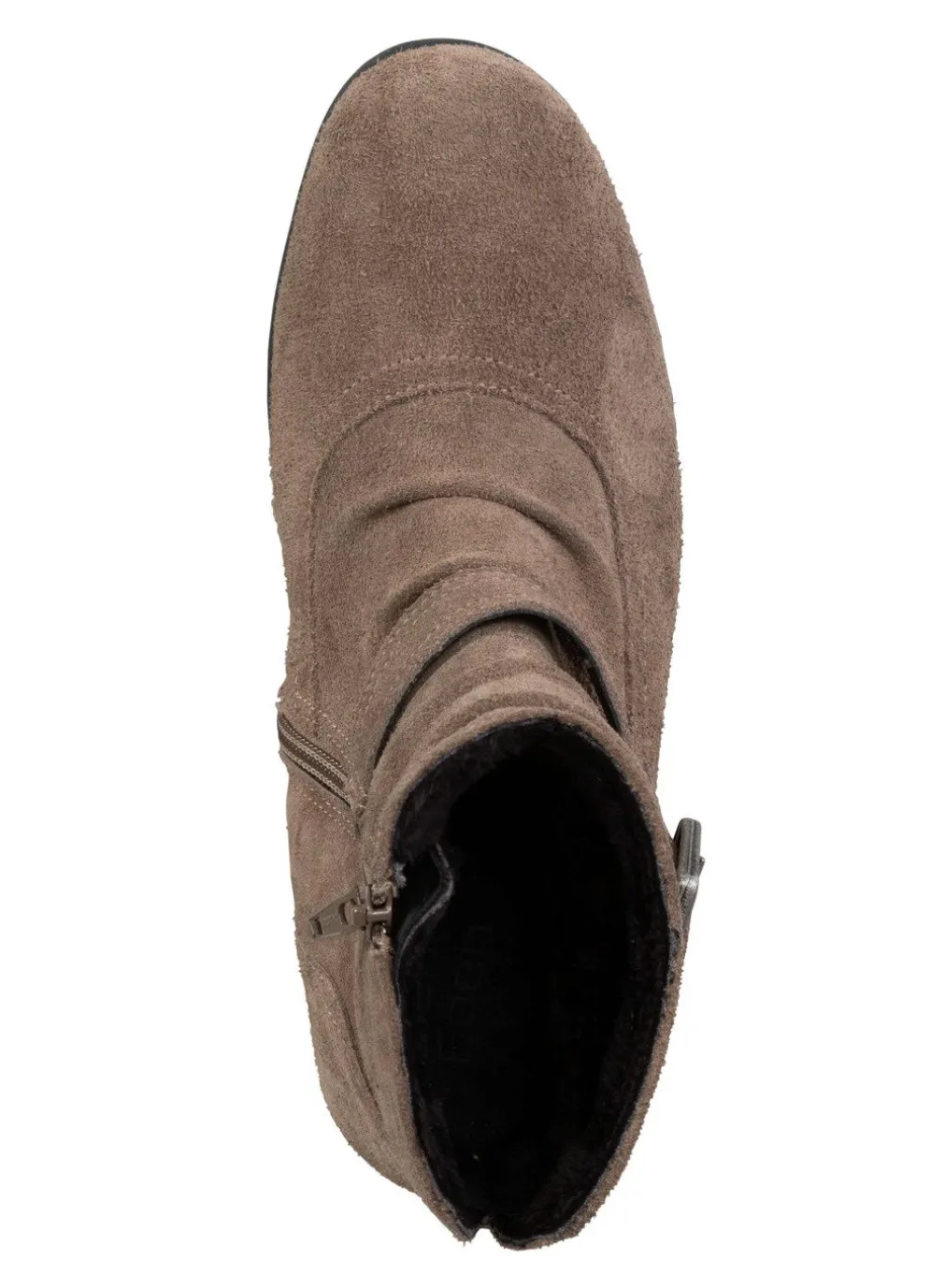ELENA-EDEN-Stiefelette aus Veloursleder, mit flotter Raffung und Zier-Schließe: Weite H, verdeckter Gummizug, praktischer Innenreißverschluss, wärmendes Textilfutter, herausnehmbares Fußbett, leichte PU-Laufsohle sowie 30 mm Absatz. Schafthöhe ca. 14 cm