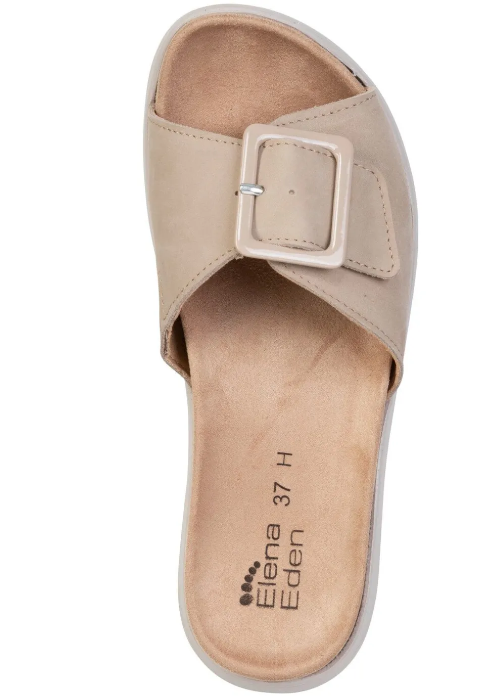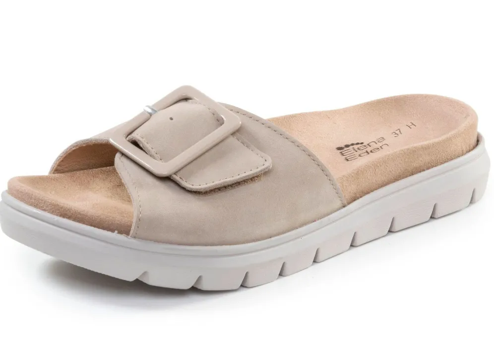 Pantoletten von ELENA EDEN aus Nubuk- oder Veloursleder: Weite H, verstellbare Klettspange mit Zierschließe, seitlicher Gummizug, Futter, herausnehmbares Fußbett sowie TR-Profilsohle mit flachem Keil