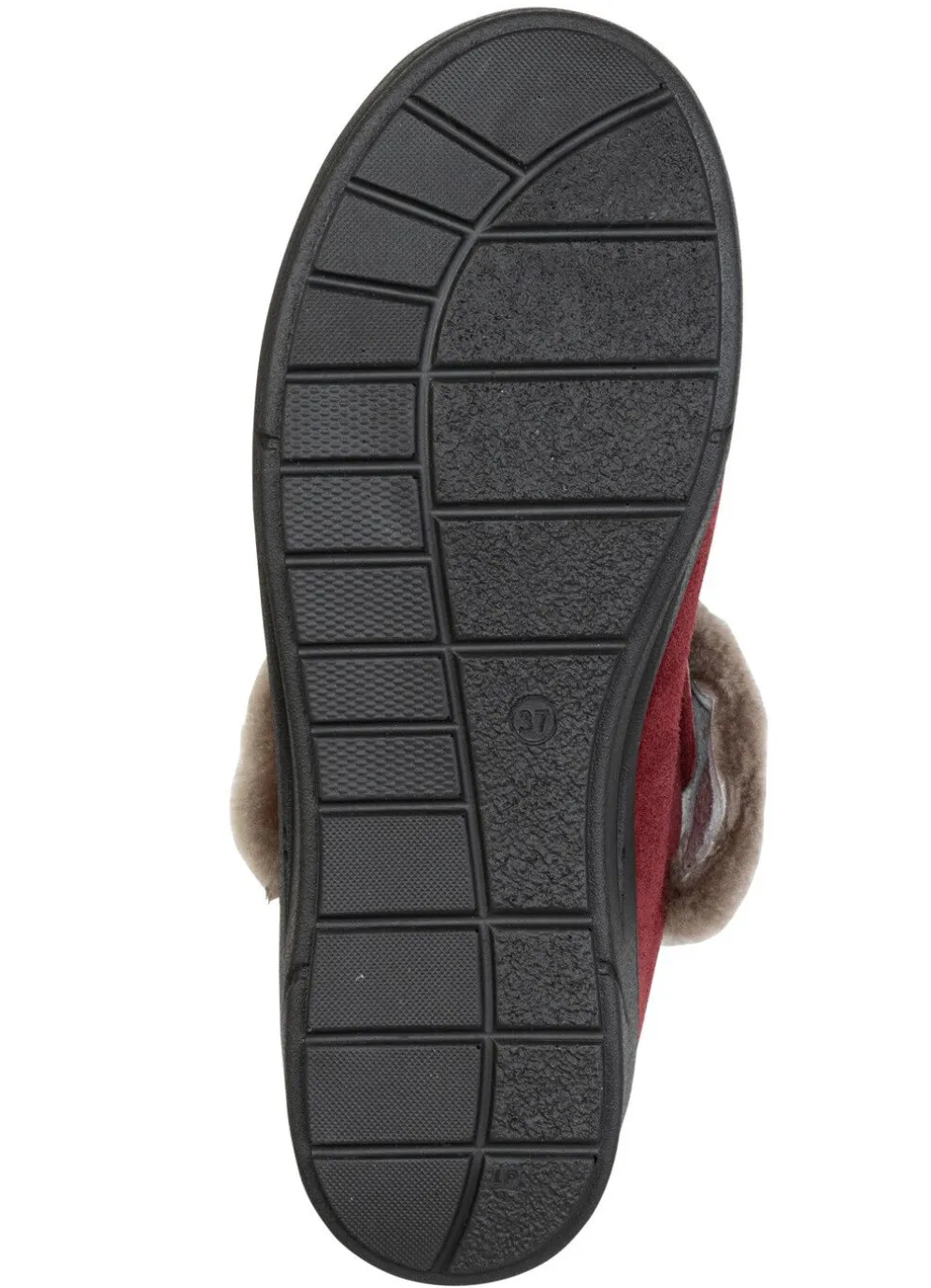 Hausschuhe von ELENA EDEN, aus Velours- und Nappaleder, mit Kragen sowie Futter und Fußbettbezug aus echtem, gewachsenem Lammfell: Weite H, leichte PU-Laufsohle sowie 25 mm Keilabsatz