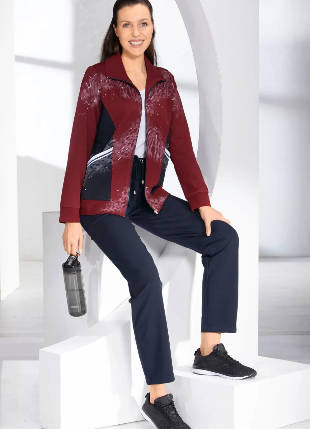 Attraktiver Freizeitanzug in Bordeaux-Marine! Oberteil mit Umlegekragen, Reißverschluss, zwei aufgesetzten Taschen mit Strickbesatz, elastischen Ärmelabschlüssen, elastischer Saumabschluss sowie Applikationen und Kontrasteinsatz im Vorderteil. Hose mit Durchzugsband und Stopper im Dehnbund sowie zwei Seitentaschen.