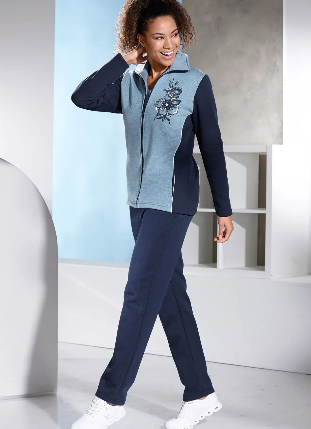 Gerade geschnittener Freizeitanzug in Jeansblau-Marine. Oberteil mit Druck im Vorderteil links und Seitentaschen. Hose mit Kordelzug im Dehnbund.