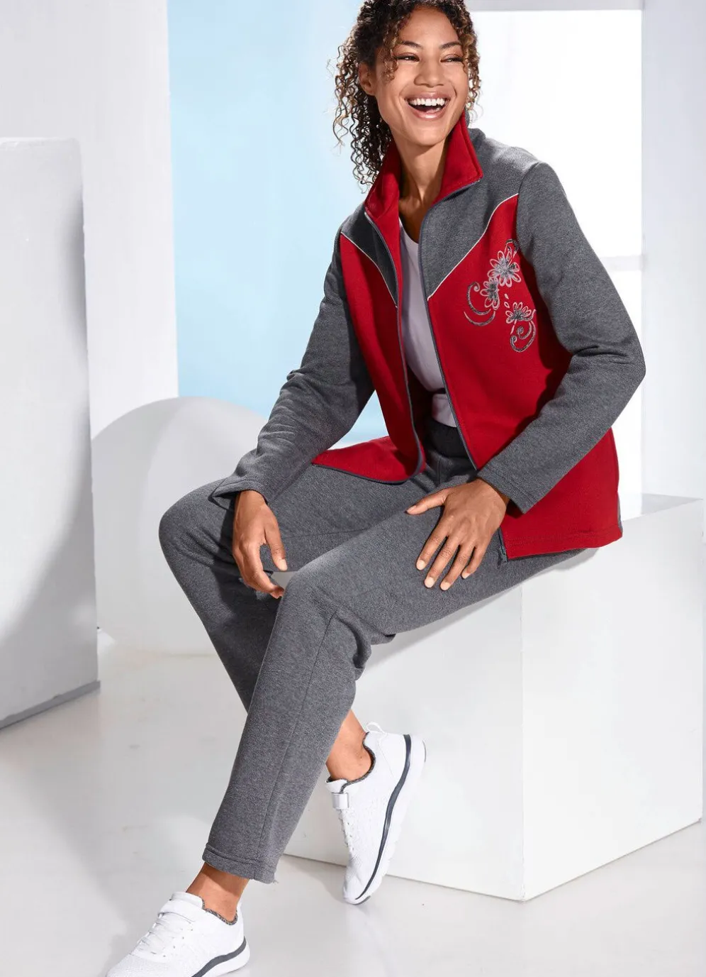 Attraktiver Freizeitanzug in Dunkelrot-Anthrazit! Oberteil mit Reißverschluss, Druck am Vorderteil links und Glitzerpaspeln sowie zwei Seitentaschen. Hose mit Dehnbund und Kordelzug sowie zwei Seitentaschen.