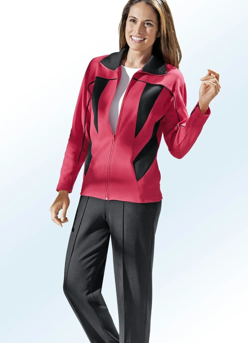 Freizeitanzug in Rot-Schwarz: Das gerade geschnittene Oberteil ist mit durchgehendem Reißverschluss, Kontrast-Verarbeitung im Vorderteil sowie zwei Seitentaschen gearbeitet. Dazu gehört die schwarze Hose mit Dehnbund, zwei Seitentaschen, Biesennaht sowie geraden Beinabschlüssen.