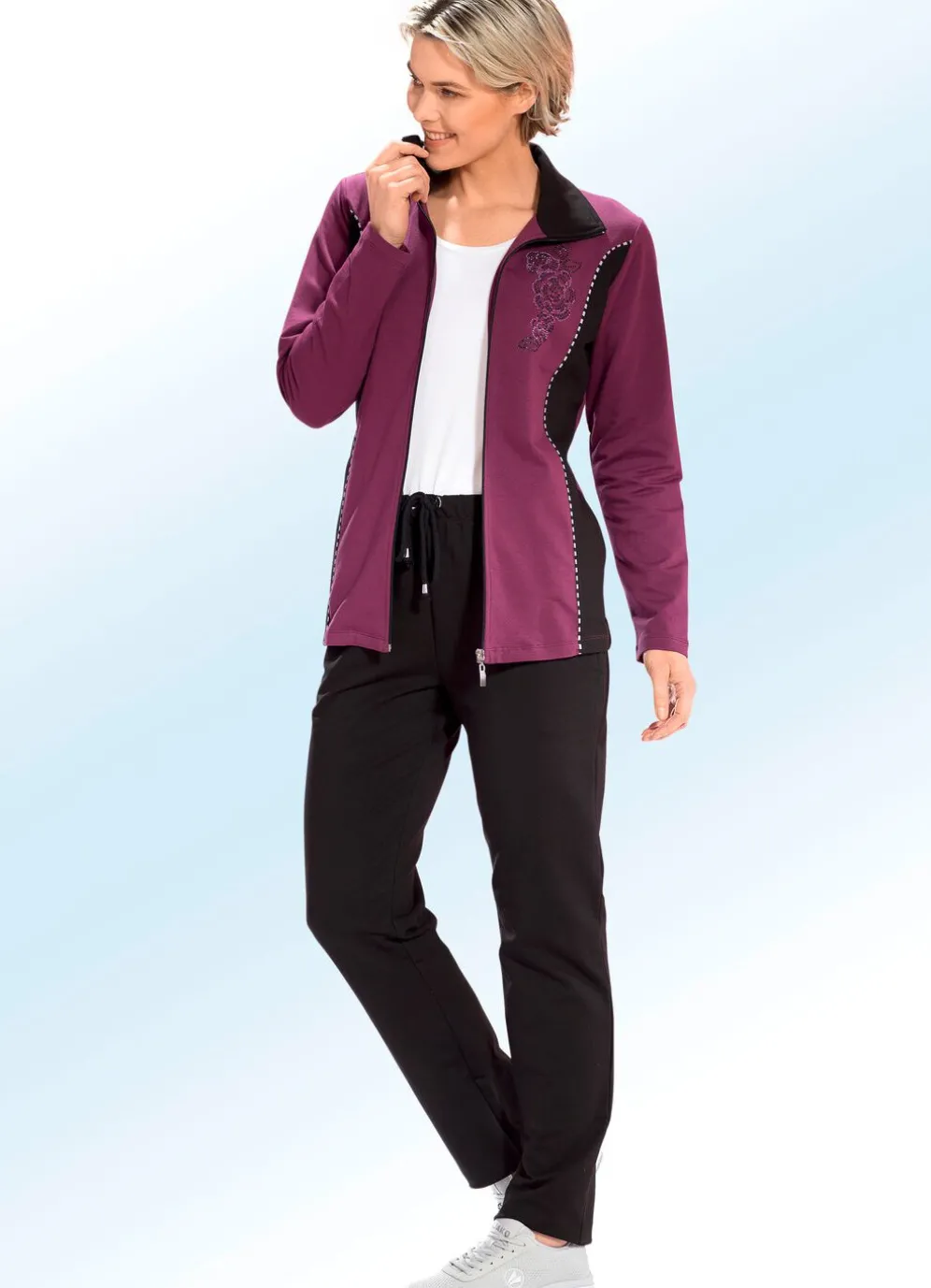Gerade geschnittener Freizeitanzug in Beere- Schwarz! Oberteil mit Umlegekragen, Reißverschluss, Applikation im Vorderteil links, Kontrasteinsätzen und Zierpaspeln im Vorderteil sowie Seitentaschen. Hose mit Kordelzug im Dehnbund, Seitentaschen sowie geraden Beinabschlüssen.