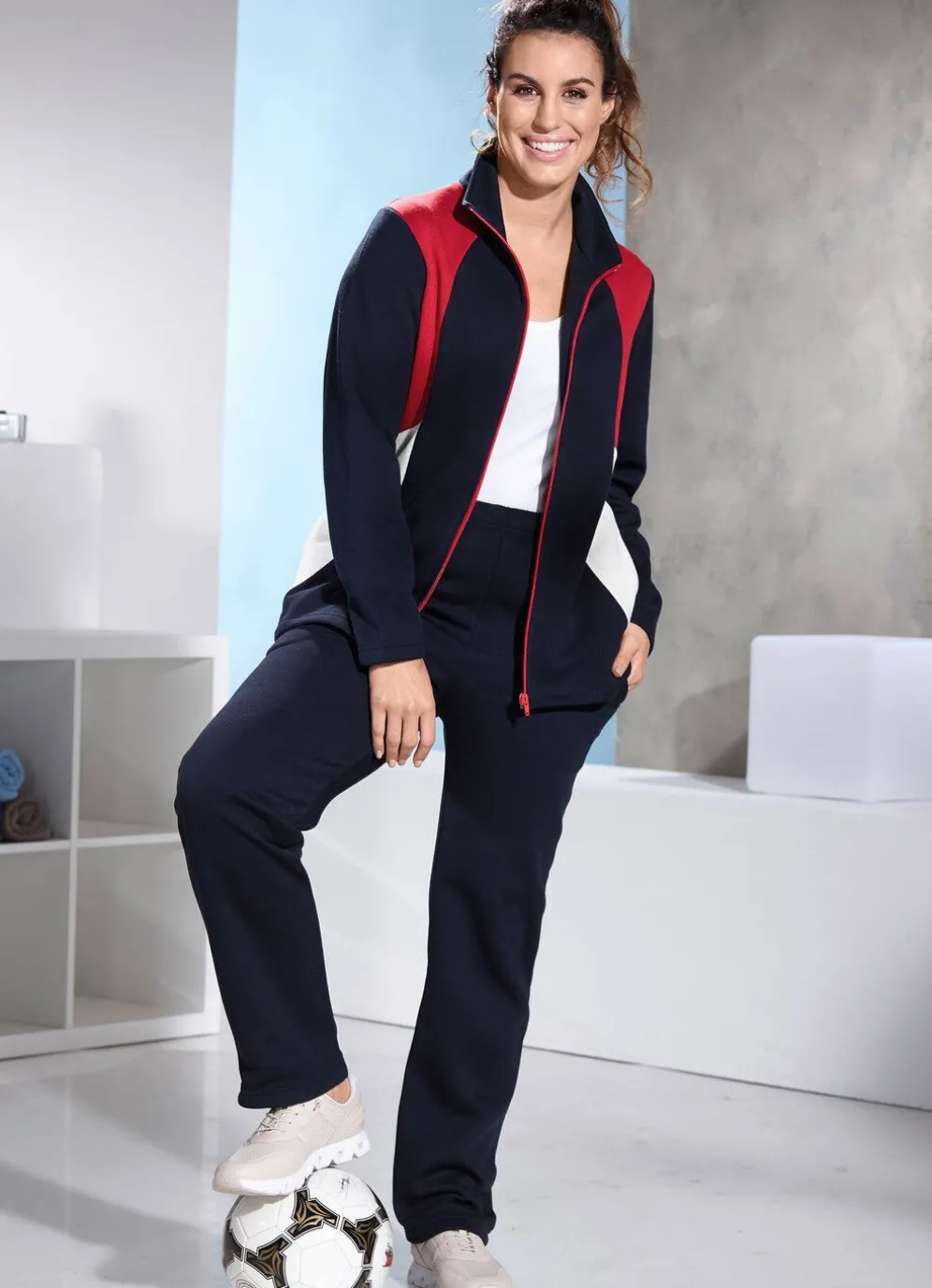 Gerade geschnittener Freizeitanzug in Marine-Rot-Natur. Oberteil mit Reißverschluss und Seitentaschen. Hose mit Kordelzug im Dehnbund und Seitentaschen.