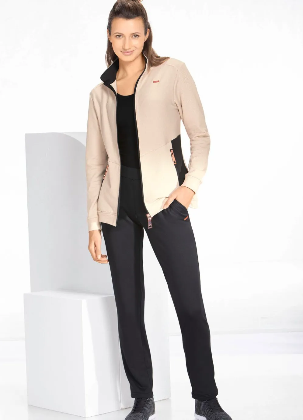 Lassen Sie sich diesen Freizeitanzug von „LPO“ in Beige-Anthrazit nicht entgehen! Mit Stehkragen, Reißverschluss, Seitentaschen mit Reißverschluss, elastischen Ärmelbündchen und Saumabschluss sowie Stickerei links. Hose mit Dehnbund und Seitentaschen, hautsympathische, und angeraute Innenseite.