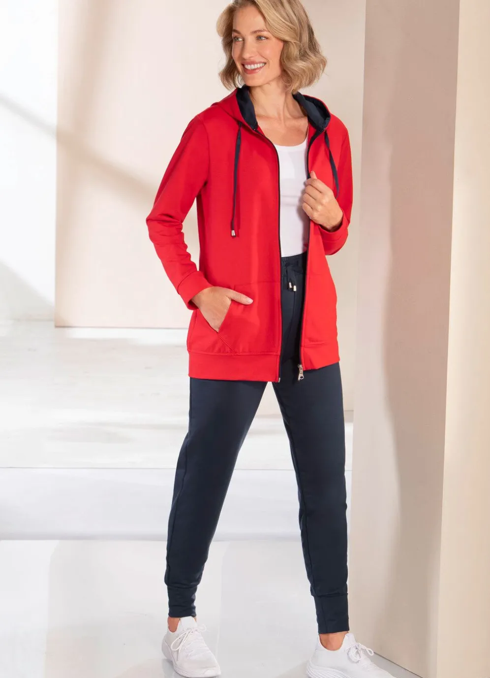 Rot-blauer „Plantier”-Freizeitanzug mit Durchzugsband und Stopper an der angeschnittenen, kontrastgefütterten Kapuze, Kängurutaschen, elastischen Armabschlüssen, länger geschnittenem Rückteil sowie elastischem Saumabschluss. Hose mit Durchzugsband und Stopper im Dehnbund, Seitentaschen sowie elastischen Beinabschlüssen.